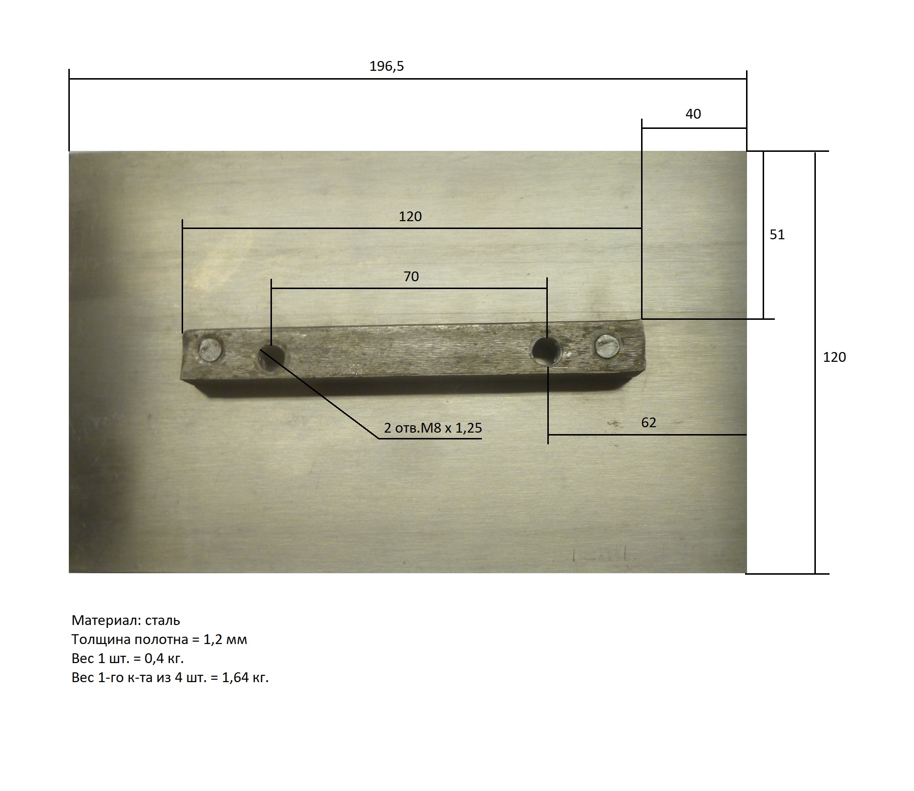 Лопасти для ТСС DMD-600 (к-т из 4 лопастей). Вес=1.6кг Лопасть в сборе : 1)Пластина :длина =192 мм,ширина =125 мм 2)Планка с отверстиями (2) М8 межцентровое =70 мм. отверстия на бруске -14х14х120 мм,