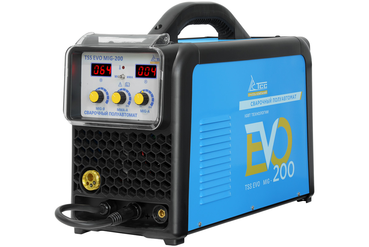 ТSS EVO MIG-200 - сварочный полуавтомат инверторный. Компактный, легкий, удобный для переноски, а также при транспортировке, хранении. Корпус из листовой стали, надежно защищает внутренние элементы от повреждения. Предназначен для полуавтоматической сварки в среде защитных газов (MIG/MAG), а также ручной дуговой сварки покрытым электродом (ММА). Аппарат имеет защиту от перегрузки, индикатор перегрева и неисправности, обеспечивая высокий уровень безопасности и надежность устройства. Так же данный аппарат имеет защиту от скачков напряжения. Высокое напряжение холостого хода обеспечивает легкость поджига сварочной дуги. Высокая стабильность сварки в реальном времени, простое интуитивно понятное управление сварочными параметрами.